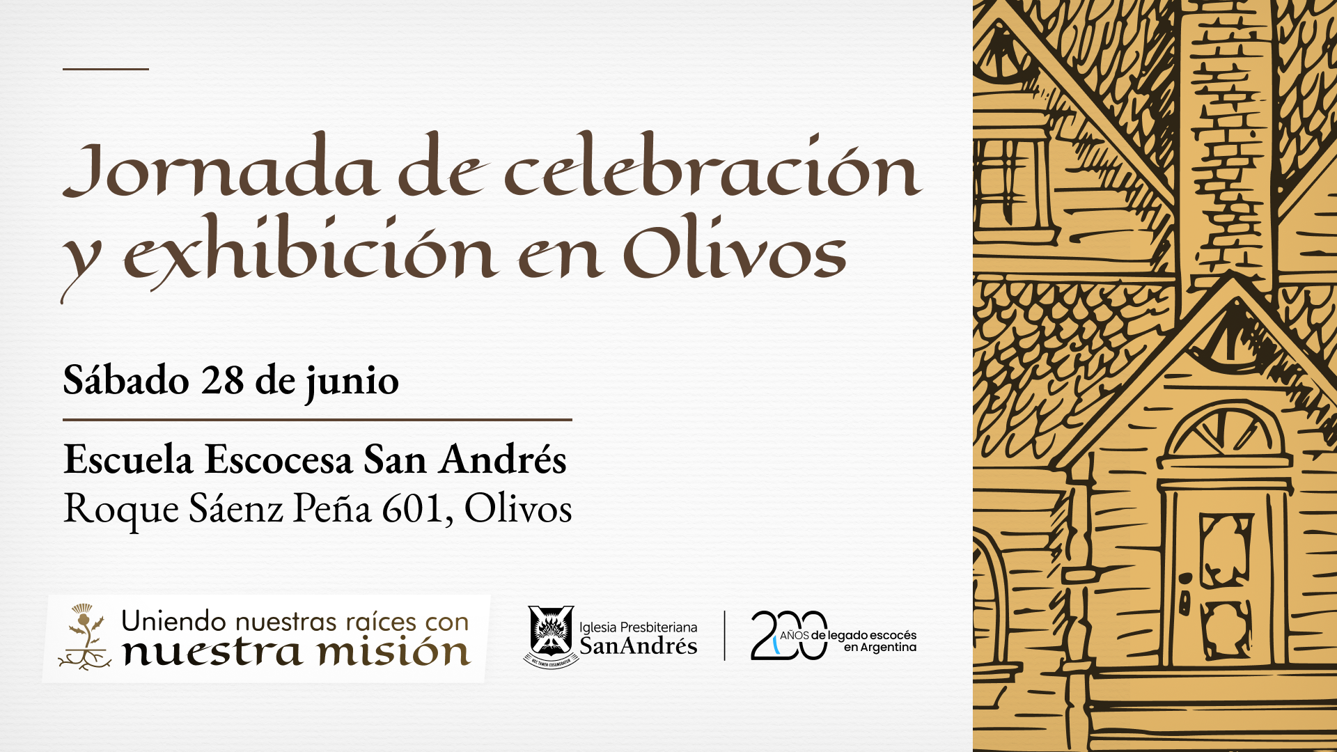 SAVE THE DATE: Sábado 28 de junio a las 15:00 hs. Encuentro Presencial Jornada de celebración y exhibición en Olivos Escuela Escocesa San Andrés Roque Sáenz Peña 601, Olivos Uniendo nuestras raíces con nuestra misión (Iglesia Presbiteriana San Andrés - 200 años de legado escocés en Argentina)